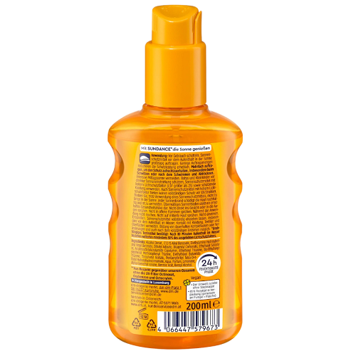 Sommer, Sonne, Sonnenbrand? Nicht mit dem transparenten Sonnenspray von SUNDANCE. Der Sonnenschutz mit LSF30 bewahrt die Haut vor schmerzhaftem Sonnenbrand und schützt vor schädlichen UV-Strahlen. Dank der transparenten Formel zieht das Spray schnell ein, ohne zu kleben, fetten oder weiße Rückstände zu hinterlassen. Der Sonnenspray spendet überdies bis zu 24 Stunden Feuchtigkeit und verhindert so ein Austrocknen der Haut. Hautverträglichkeit dermatologisch bestätigt. Wasserfest* (*Unabhängiges Testinstitut bestätigt: Nach 40 Minuten Aufenthalt im Wasser bestehen weiterhin mindestens 50 % des ausgelobten Lichtschutzfaktors). Aus Respekt gegenüber unseren Ozeanen ohne die UV-Filter Octinoxat, Oxybenzon und Octocrylen. Vegan.